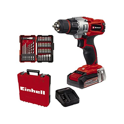 El taladro percutor con batería TE-CD 18/2 Li-i +22 (1×2,5 Ah) de Einhell es un todoterreno en las tres disciplinas más importantes del aficionado doméstico. La función de atornillado, perforación y perforación con impacto se reúnen óptimamente en esta herramienta sin cables. Como miembro de la familia Power X-Change se ofrece libertad sin cables – en todo momento y lugar. El engranaje de 2 velocidades le sirve al usuario para el atornillado potente y perforación rápida. Además, la función de perforación con percusión incluida se ocupa de la aplicación cuidadosa con las articulaciones al trabajar en hogar, taller y garaje. En la marcha respectiva se proporciona el número de impactos ideal. El portabrocas de sujeción rápida de carcasa única (13 mm) es de metal macizo. Sea punta o broca, el accesorio adecuado puede cambiarse rápidamente con el bloqueo de husillo automático. El acoplamiento deslizante del par da lugar a un trabajo sensible al usar filigranas. Bajas velocidades de giro en materiales blandos no son un problema, con los 20 niveles de par. El agarre suave ergonómico favorece el trabajo cómodo también en el caso de aplicación más prolongada. Así, la zona de trabajo se ilumina óptimamente por la luz LED. El set está listo para usar inmediatamente con los extensos accesorios. Al alcance del envío pertenecen el práctico clip de cinturón, una batería PXC de 2,5 Ah y cargador rápido y un amplio set de puntas y brocas con 22 piezas, todo se guarda limpio en el práctico maletín E-Box Basic.